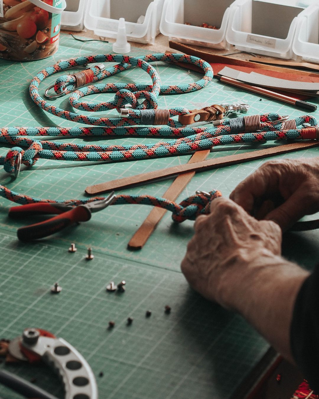 Die Leine fertigen wir aus robustem, farbenfrohem Kletterseil. Sie hat zudem eine angenehm weiche Handschlaufe aus Fettleder, die dir ein besonders komfortables Handling ermöglicht.