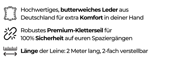 Mit dieser einzigartigen Leine führst du deinen Hund sicher und stilvoll durch den Tag. Das robuste Kletterseil und die widerstandsfähigen Karabiner sind so konzipiert, dass auch kräftige Hunde 100% sicher an der Leine geführt werden können.
